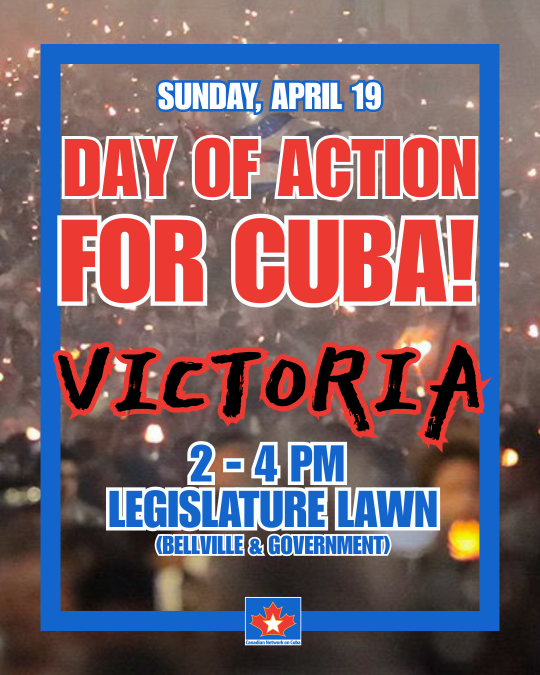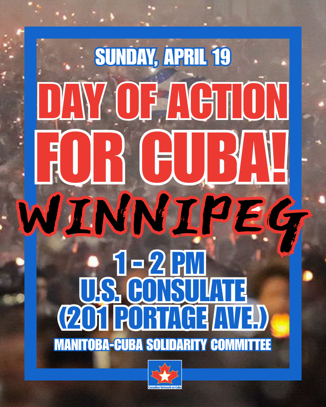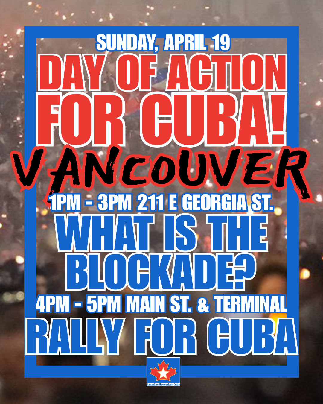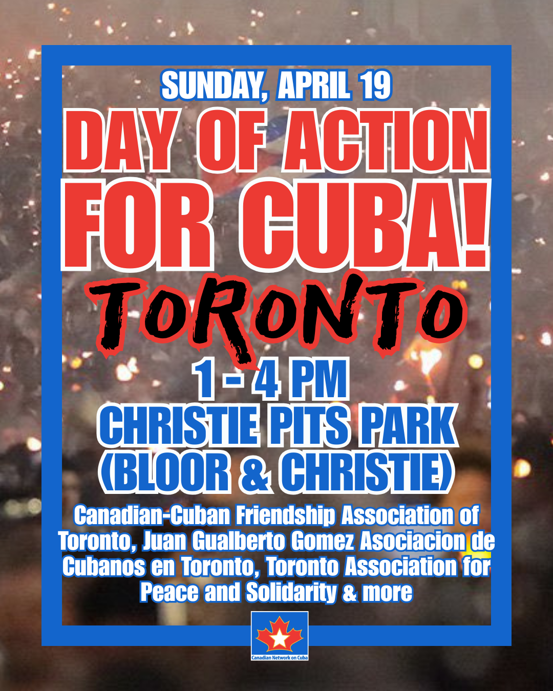 The Canadian Network on Cuba has called for a Day of Action on Sunday, April 19th. Member groups have been hard at work organizing actions in cities all across Canada.