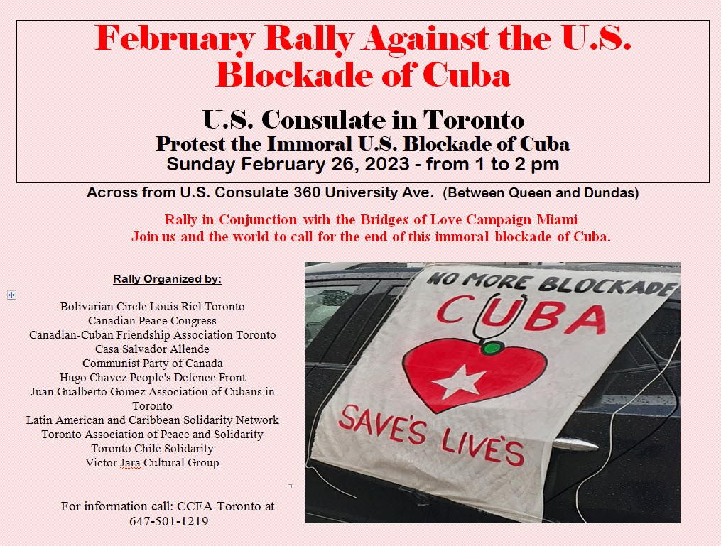 CCFA-Toronto and other groups have organized a rally in conjunction with the Bridges of Love Campaign Miami. Join us and the world to call for the end of this immoral blockade of Cuba. Sunday, Feburary 26, from 1 - 2 p.m. Across from U.S. Consulate 360 University Ave. (Between Queen and Dundas)
