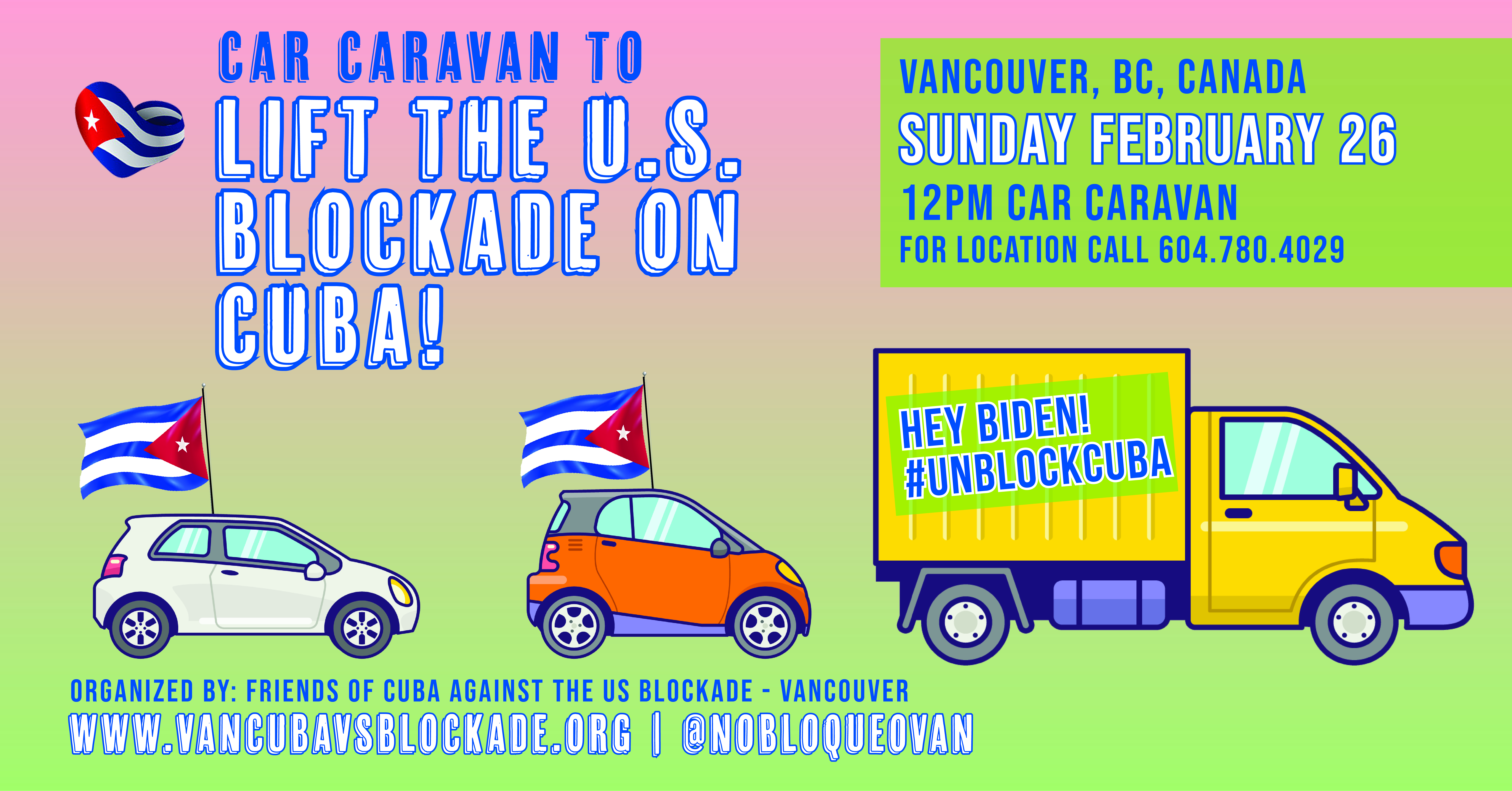 On February 26th, 2023, Friends of Cuba Against the U.S. Blockade – Vancouver (FCAB-Vancouver) will once again gather to call for an immediate end to the U.S. blockade on Cuba. There will also be a report back from four Cuba solidarity organizers who recently returned from Cuba’s First International Meeting of Theoretical Publications of Left Parties and Movements. The group will then hit the streets with our vehicles covered in anti-blockade signs and Cuban flags while demanding: Lift the blockade on Cuba now! Cuba si, bloqueo no! Abajo el bloqueo!