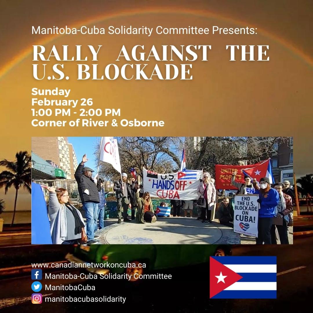 The Manitoba-Cuba Solidarity Committee will be holding a rally on Sunday, February 26th from 1pm - 2pm in Winnipeg at the corner of River Avenue and Osbrorne Street. This event as part of the world wide Puentes De Amor rallies against the illegal and inhumane U.S. Blockade on Cuba.