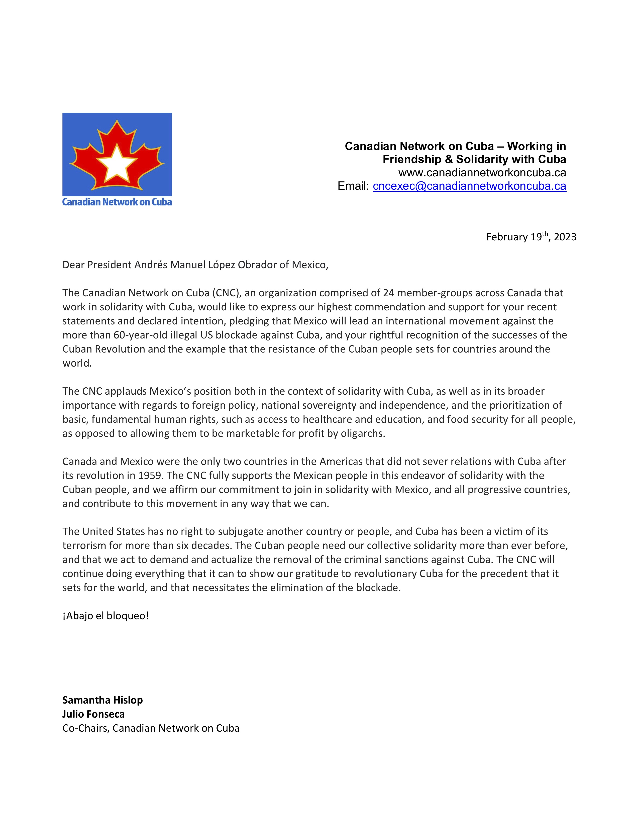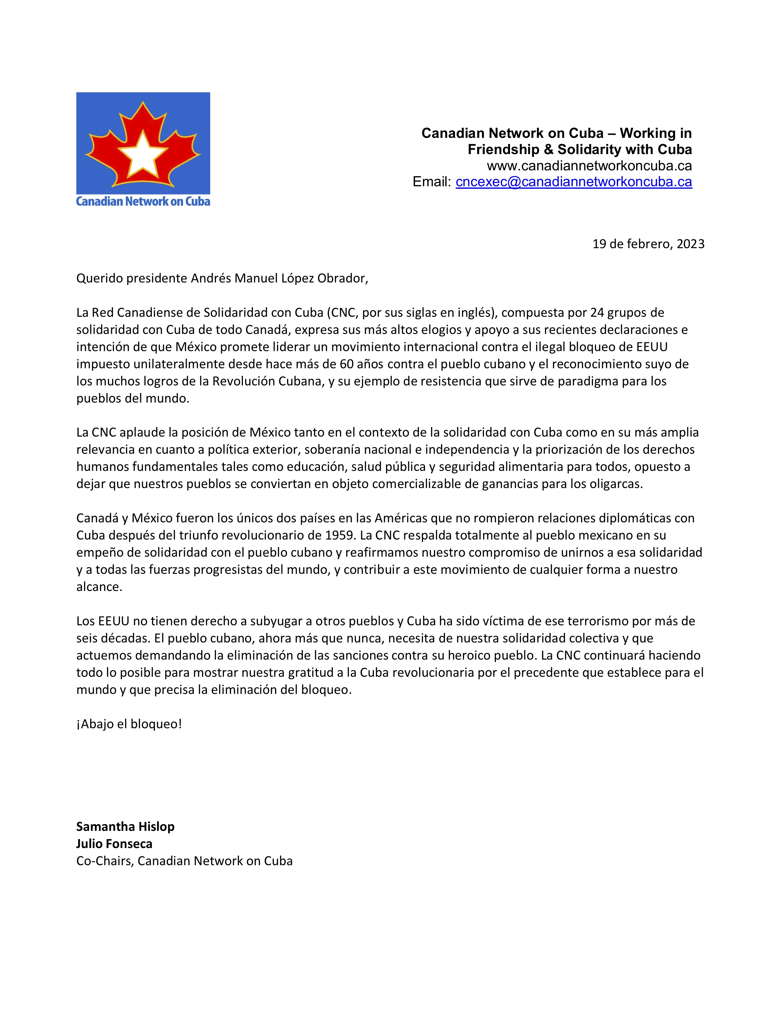 La Red Canadiense de Solidaridad con Cuba (CNC, por sus siglas en inglés), compuesta por 24 grupos de solidaridad con Cuba de todo Canadá, expresa sus más altos elogios y apoyo a sus recientes declaraciones e intención de que México promete liderar un movimiento internacional contra el ilegal bloqueo de EEUU impuesto unilateralmente desde hace más de 60 años contra el pueblo cubano y el reconocimiento suyo de los muchos logros de la Revolución Cubana, y su ejemplo de resistencia que sirve de paradigma para los pueblos del mundo.