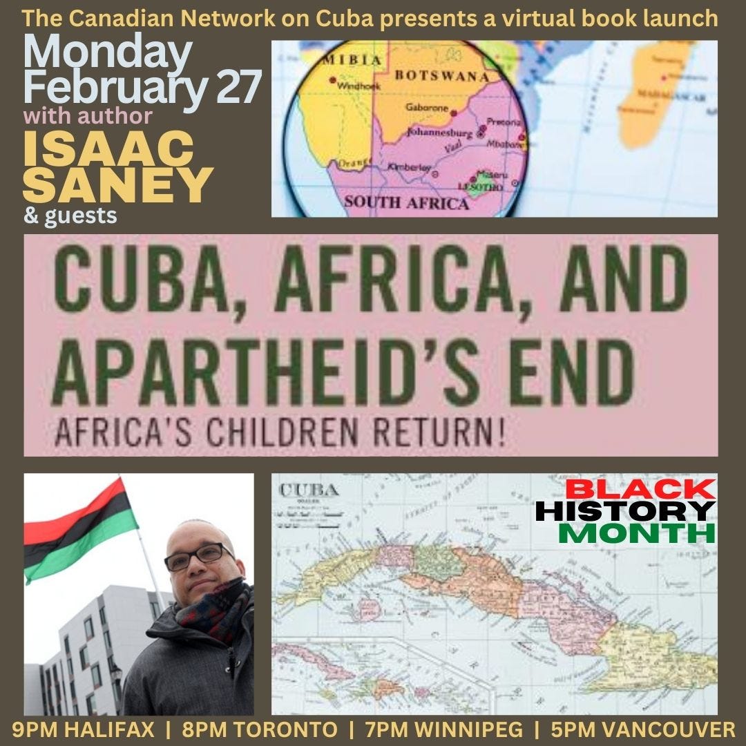 Join us on February 27th for our virtual book launch, celebrating the publication of Isaac Saney’s new book Cuba, Africa and Apartheid’s End: Africa’s Children Return!