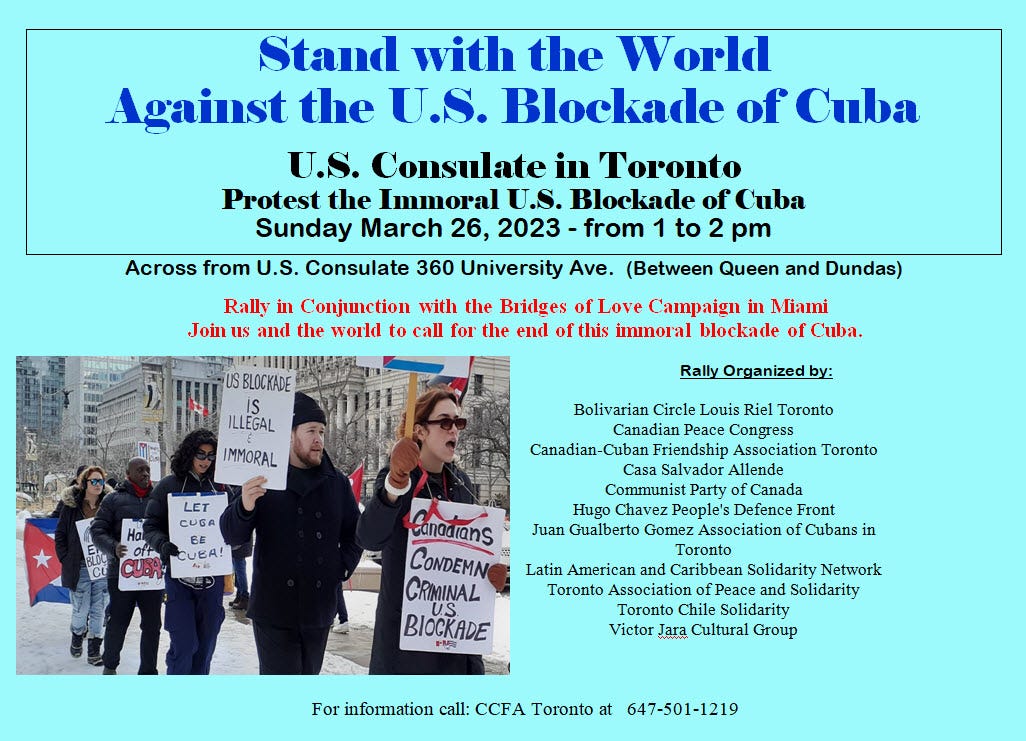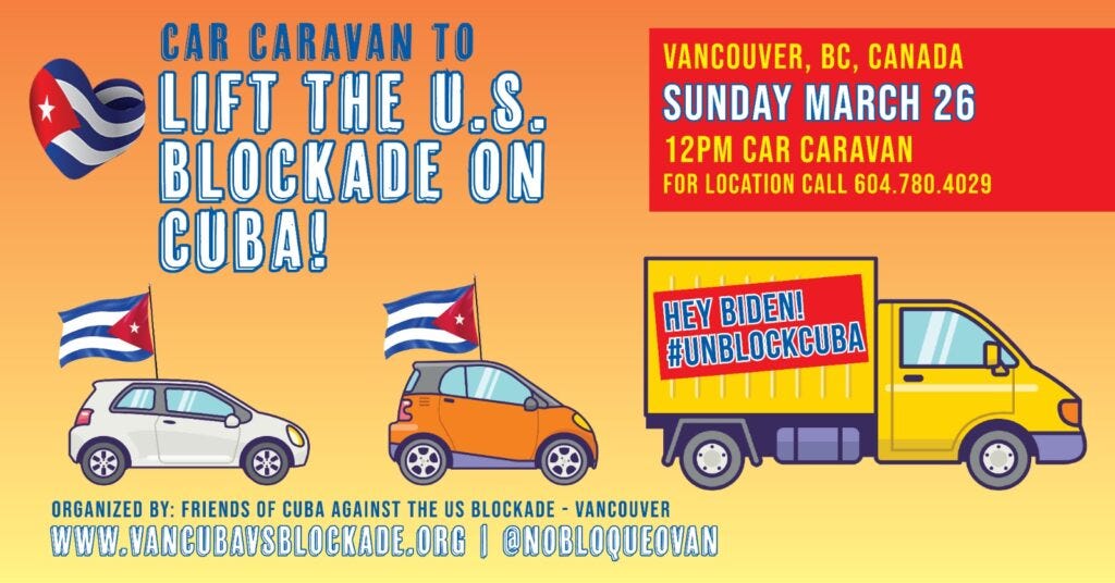 Vancouver Communities in Solidarity with Cuba will be holding their monthly Car Caravan to Life the U.S. Blockade on Cuba on March 26th at noon. For the location, call (604) 780 4029.