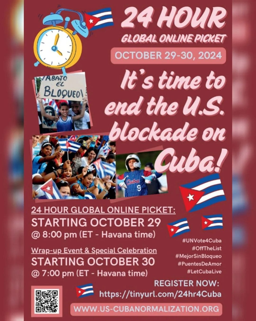 A 24-hour Global Online Picket to End the U.S. Blockade on Cuba! + Remove Cuba from the so-called "State Sponsors of Terrorism" list! begins Oct. 29 at 8 p.m. Cuba time and ends Oct. 30 at 7 p.m.