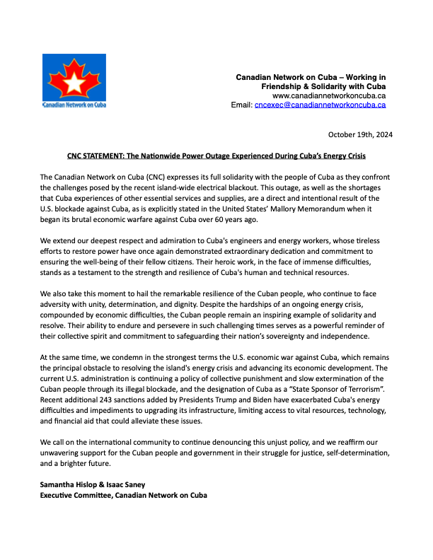 As you have almost certainly heard, Cuba's energy crisis recently reached a new level of urgency. This month's CNC newsletter focuses mainly on combatting the misinformation about the crisis that is spreading on social media, mainstream media and from imperialist governments. The root cause of this crisis is nothing other than the unilateral, illegal and genocidal blockade against the Cuban people by the world's leading imperialist force, the government of the United States of America. Lift the blockade and let Cuba live!
