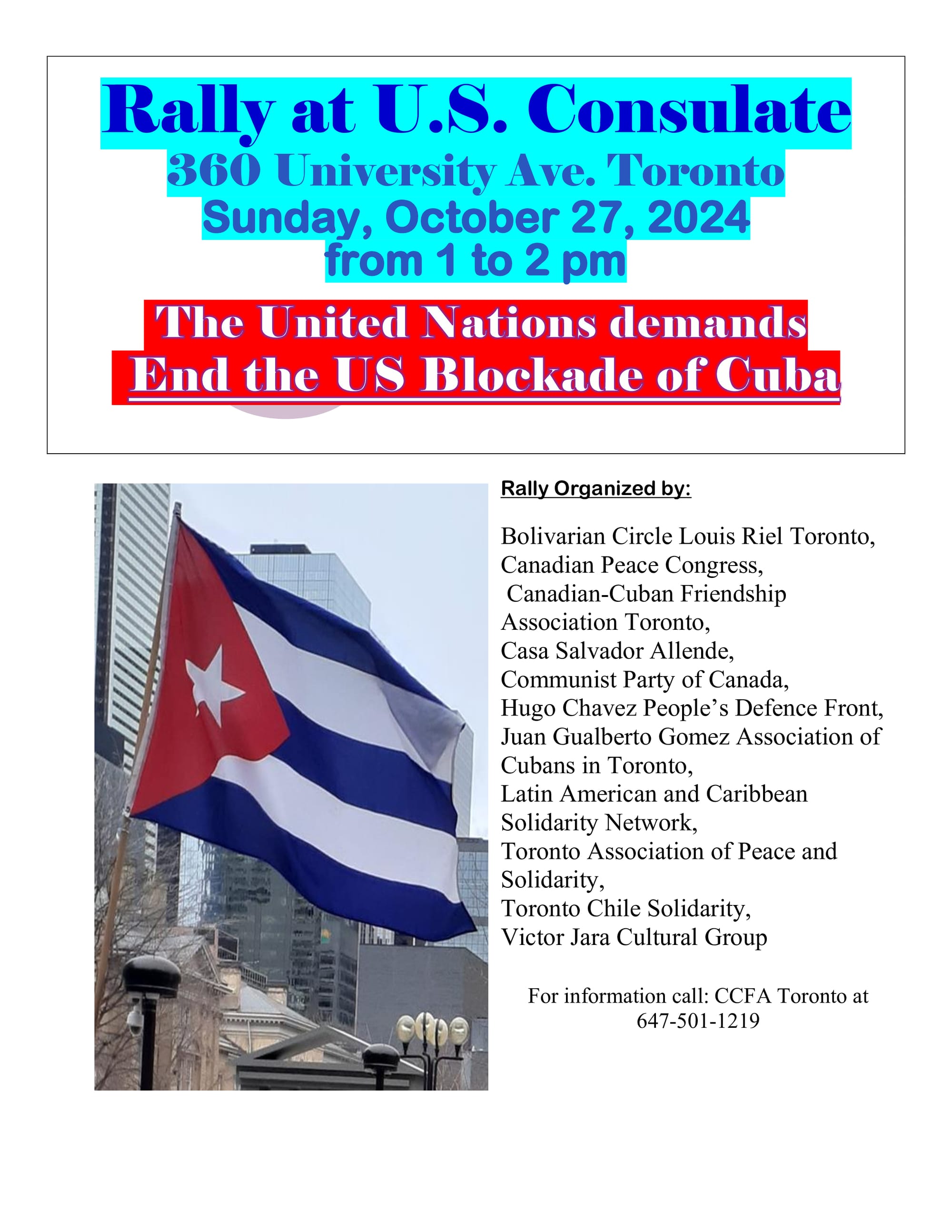 In October 2024 Cuba will bring a resolution to the United Nations to end the cruel U.S. Blockade on Cuba for the 32nd consecutive vote! While the government of the U.S. votes “no” to ending the inhuman and illegal blockade, the people of the United States & the world vote “YES”! International actions will take place around the world October 26-30 marking the annual United Nations General Assembly vote. Join us for the 24-hour global online picket with a program of speakers, documentaries, music, and more as we stand by Cuba and its just demand for an end to this cruel U.S. policy.