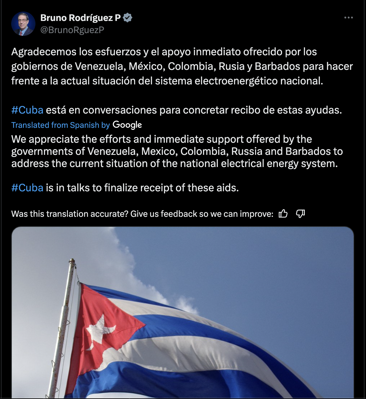 "However, the impossibility of maintaining constant flows in the acquisition of fuel necessary for the operation and maintenance of the country’s thermoelectric power plants continues to be an aggravating factor in the current situation regarding the sustainability of the electric service, beyond the announced reestablishment. Until the blockade is ended once and for all and Cuba is allowed to trade normally with the world this types of crisis will re occur."