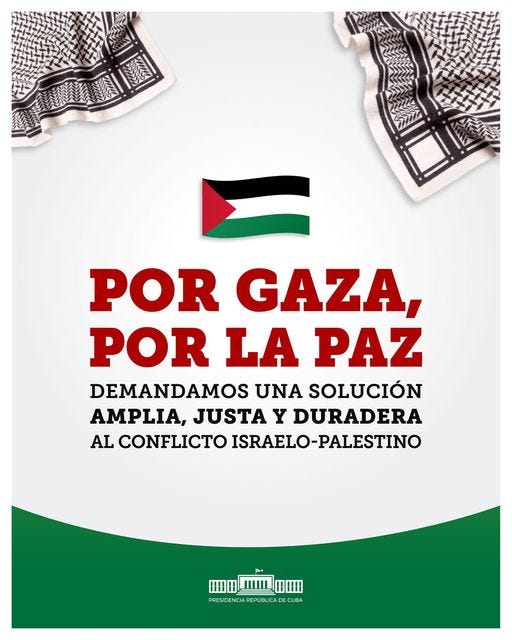 "Very moving to see in the news a young Palestinian doctor graduated in #Cuba, saving lives in the midst of the massacre committed by Israel against that brotherly people. His words touched us all. Always count Palestine with the solidarity of Cubans.”
