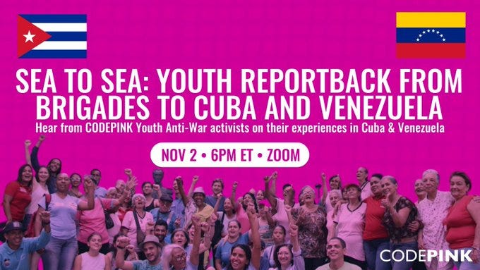 Join CODEPINK activists who participated in organizer exchange brigades to Cuba and Venezuela in 2023. Hear stories of their experiences on the ground, how their brigade expanded their internationalist analysis, and what they feel is young people's stake in promoting peace. This event is open to the public but will be particularly focused on the youth perspective - we encourage young internationalists to attend!
