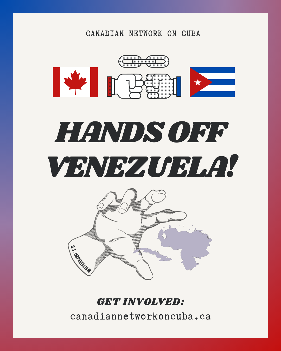 The Canadian Network on Cuba calls on all peace-loving and justice seeking people to oppose the United States' flagrant assault on the rights of the Venezuelan people and the wider region, and to resist the dangerous normalization of imperial war, resource plunder, and “might-makes right” geopolitics. Write to your representatives today and tell them to end Canadian complicity in U.S. crimes against Latin America and the Caribbean.
